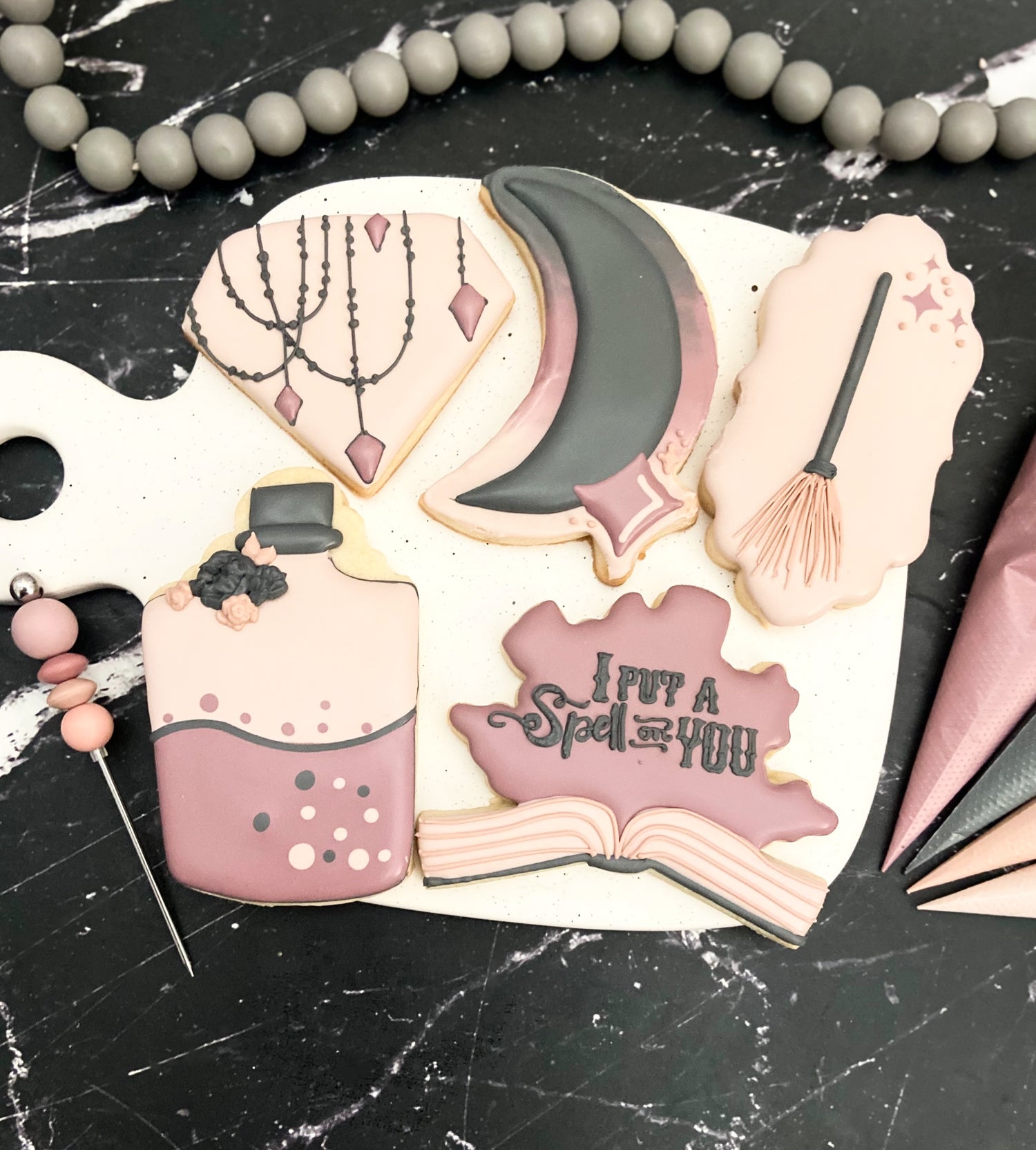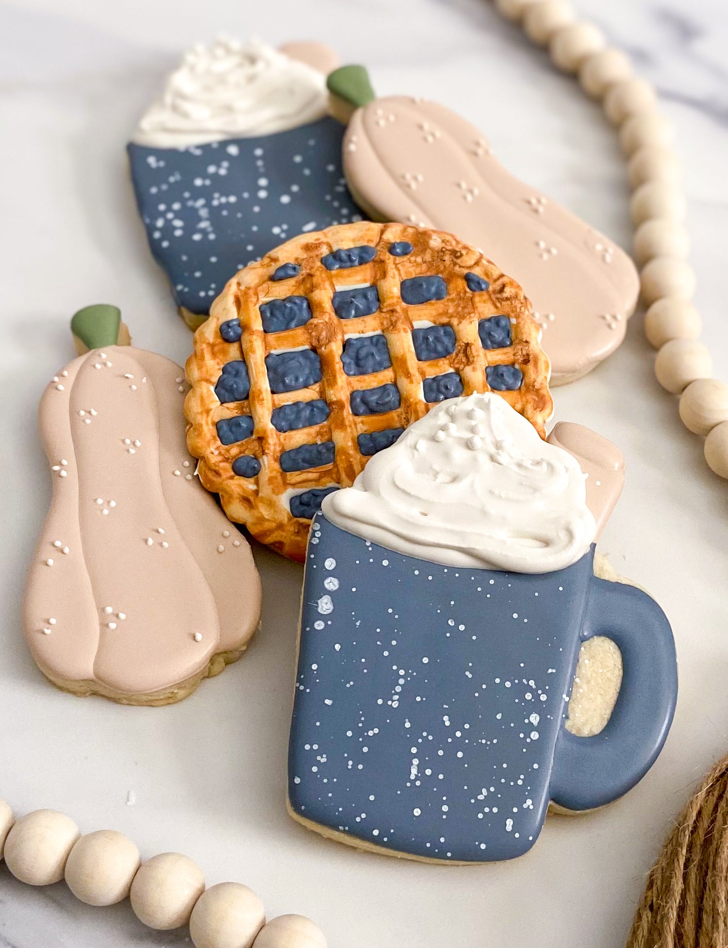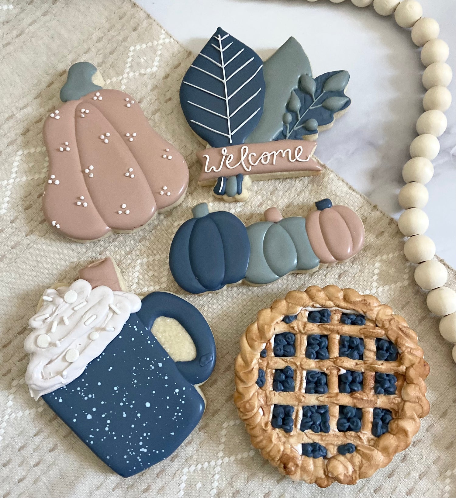 This class includes 5 cookies, 4 icing colors, a take home box, a custom cookie scribe, step-by-step instruction, as well as my signature cookie and royal icing recipe card. Our goal is to teach new techniques in every class. In this class we will be introducing edible paint. Using it to create a splatter pattern as well as to add dimension to our pie crust!